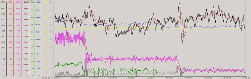When using the desulfurizer CaOH, the net flue gas SO2 content (red line) fluctuates with the original flue gas SO2 content (black line) due to the limited calcium reactivity.